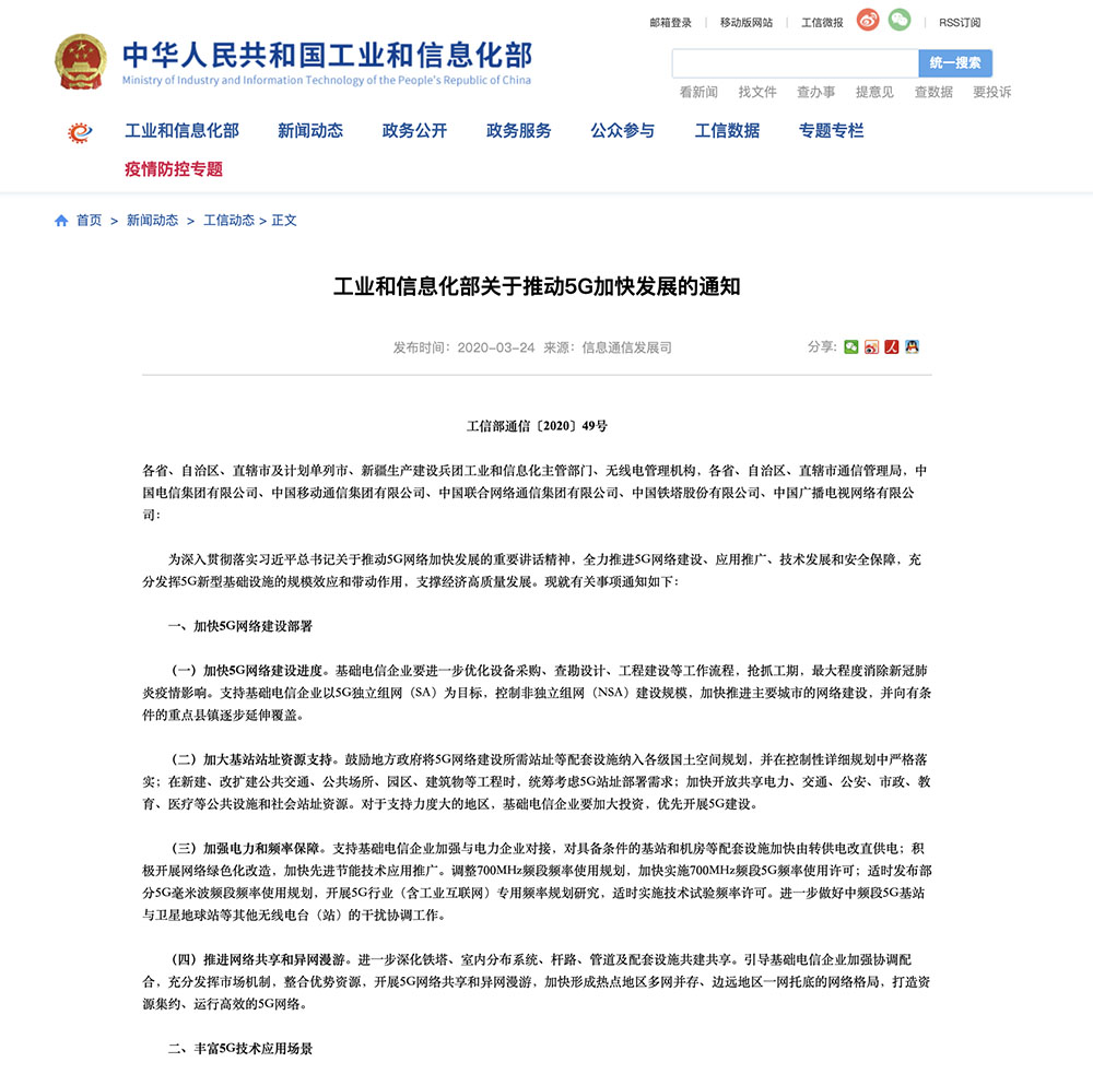 工业和信息化部关于推动5G加快发展的通知